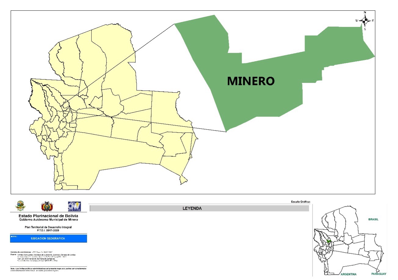 En cuanto a la extensión territorial del Municipio de Minero como tercera sección municipal de la provincia Obispo Santistevan del Departamento de Santa Cruz, tiene una superficie total de 595.21 km2 de un total de 3.673 km2 que comprende la Provincia Obispo Santistevan. En términos porcentuales el municipio de Minero representa el 16,20% sobre la superficie total de la provincia, y en cuanto al numero de hectáreas, el municipio tiene un total de 59.521,60 Hectáreas, incluida el área que se encuentra en estudio de límites con el municipio de Saavedra (9,837.38 hectáreas). Considerando que inicialmente el municipio de Minero tenia de 540.002 hectáreas antes de la creación de los municipios de Fernandez Alonzo y San Pedro.